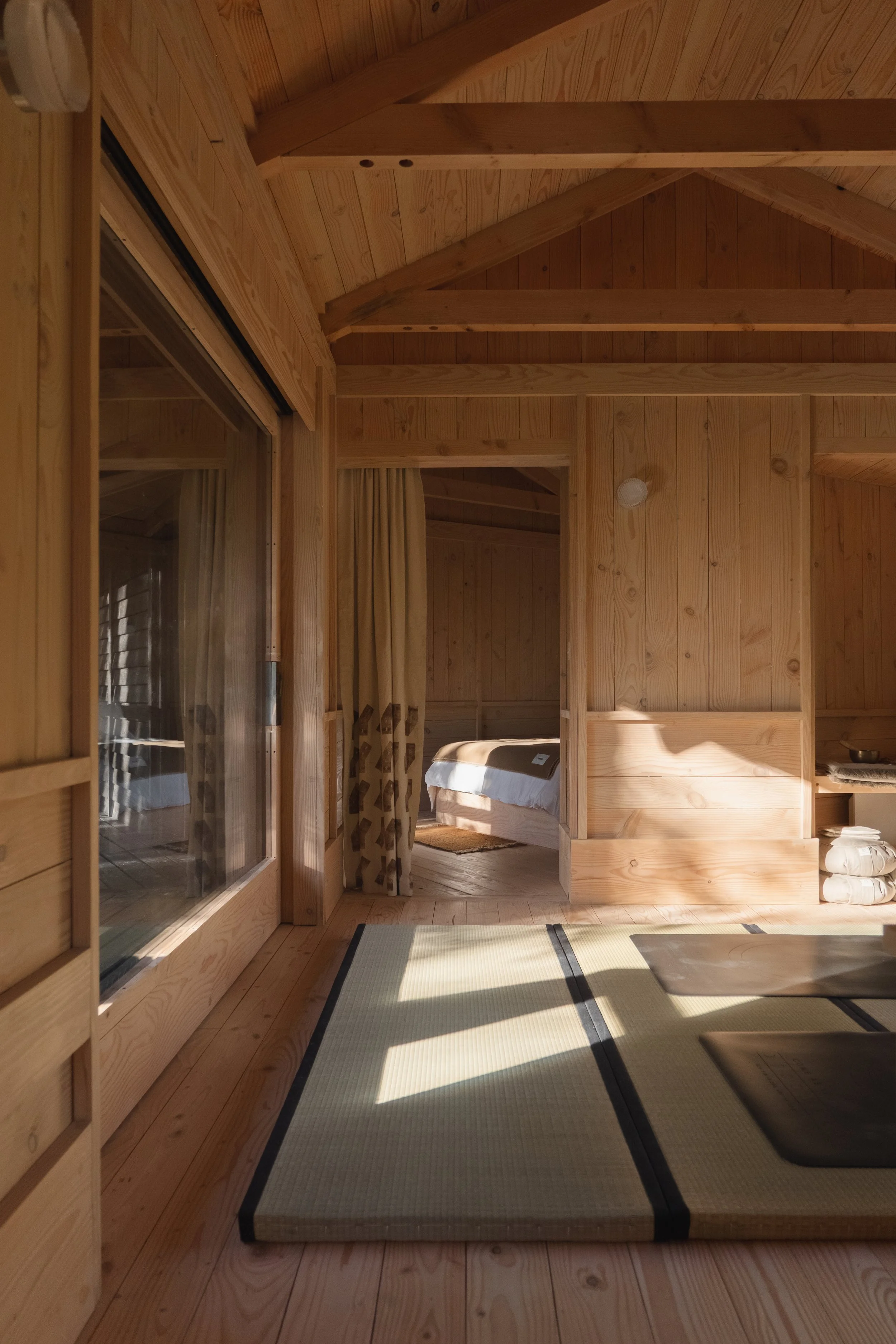 Yogis Cabin is designed around a central yoga studio, placing movement, stillness and light at the heart of the architecture. Oriented east to west, the space is defined by the daily passage of the sun — rising through a stand of alder trees to the east and setting over the spring-fed natural pond to the west. Large openings frame these moments, grounding the experience of the cabin in its immediate landscape.