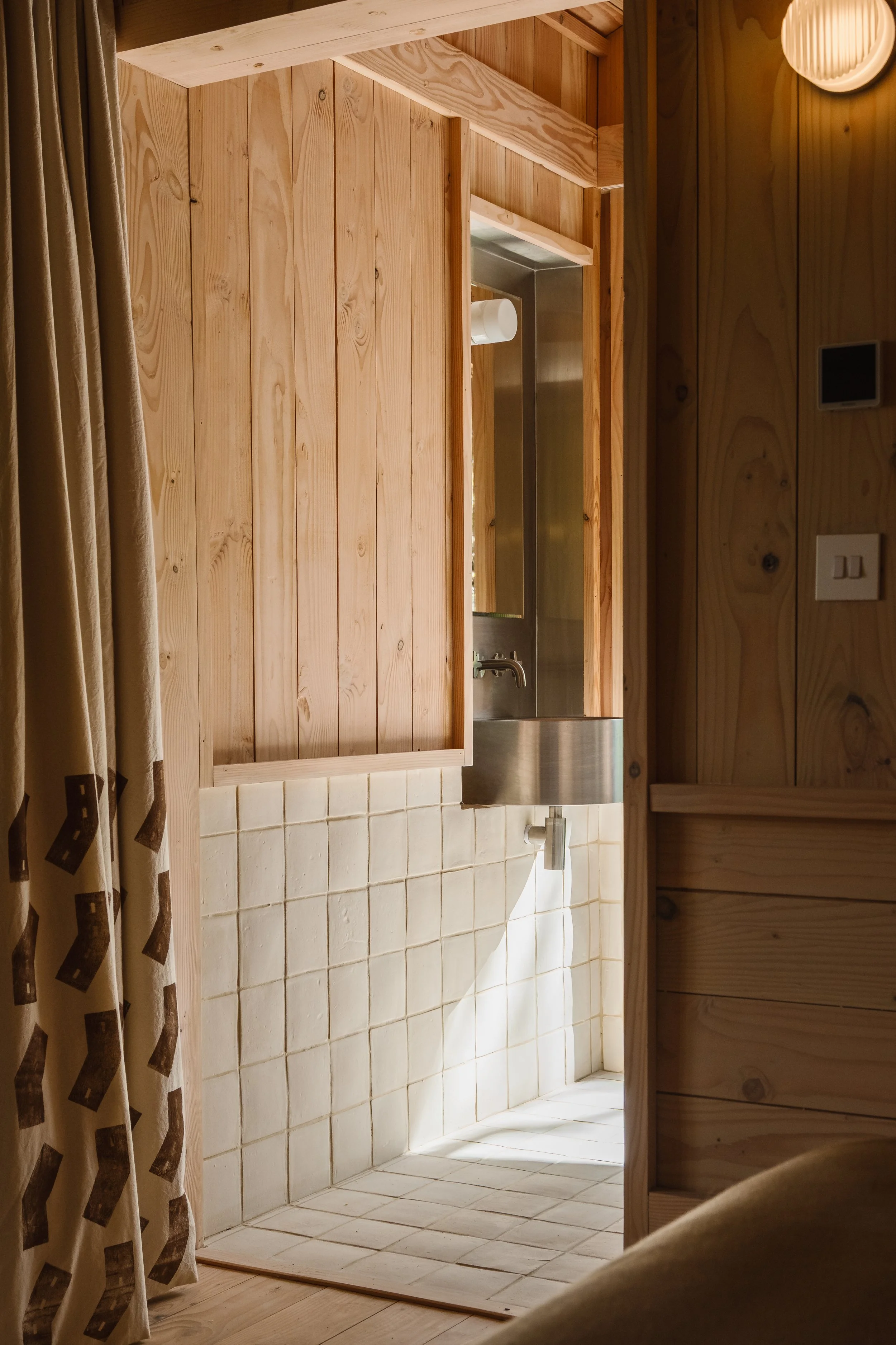 Materials are natural and tactile throughout: wood fibre insulation, bespoke tiles developed with Common Objects, and handmade organic cotton curtains designed as part of the interior scheme.