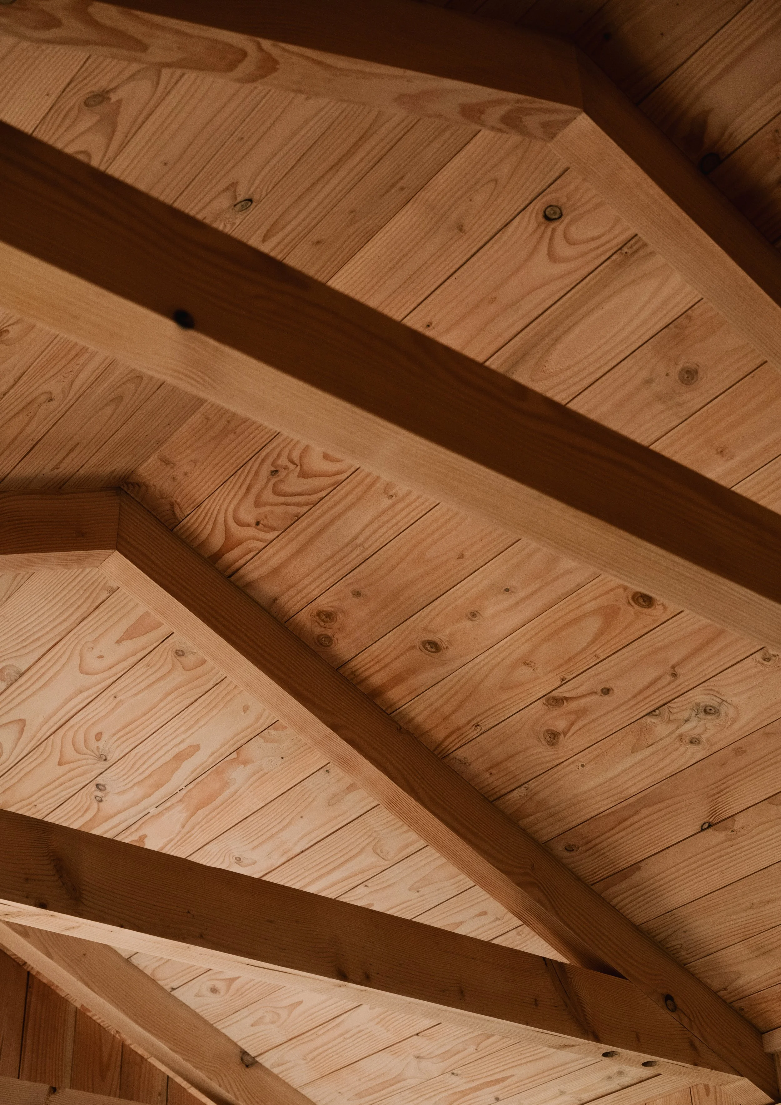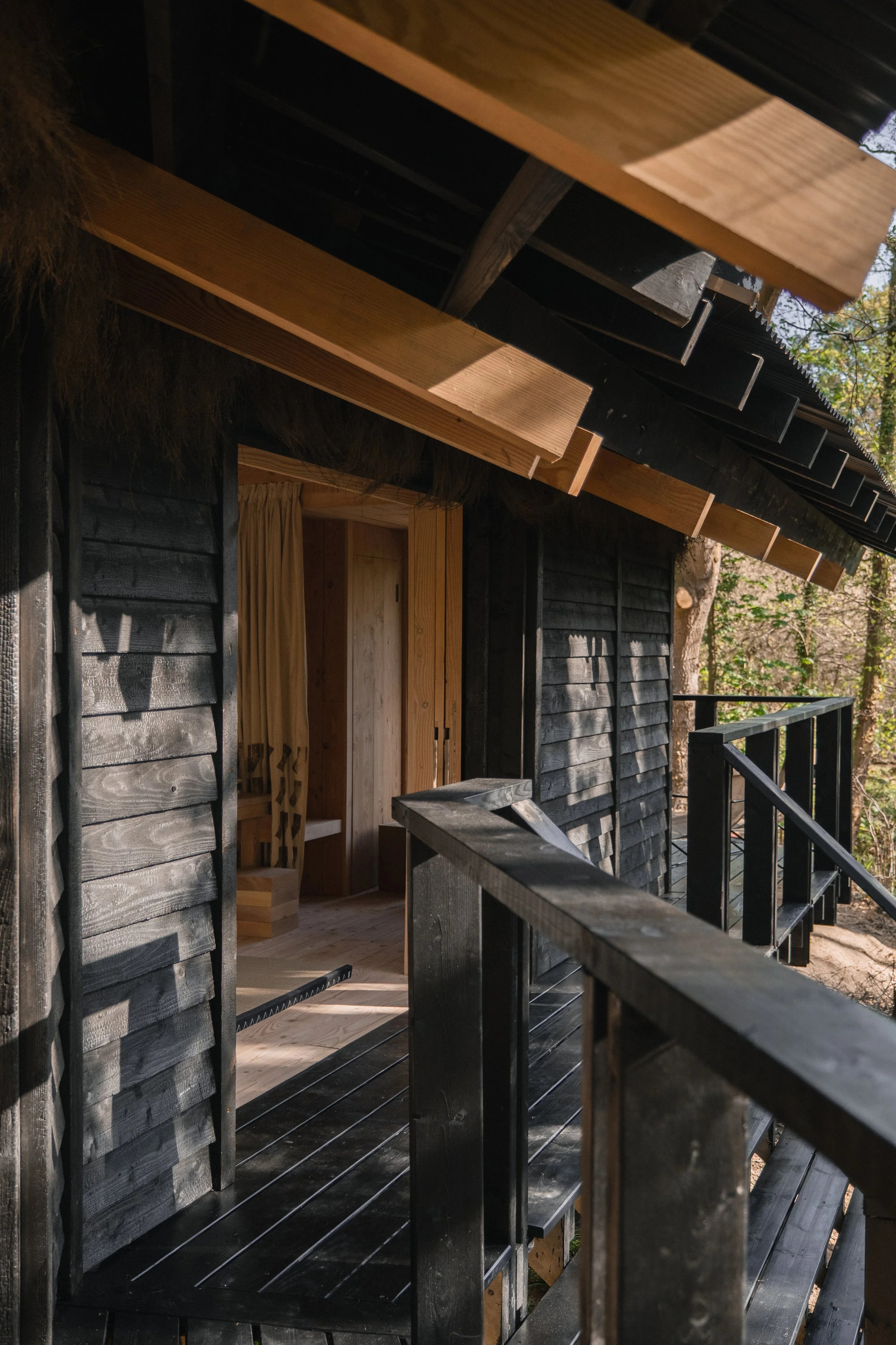Externally, a continuous engawa wraps the building, mediating between interior and forest. The structure is clad in locally sourced larch, charred to deepen its connection to the surrounding trees. Internally, the exposed structure is formed from Douglas fir sourced from slow-grown forests in the Scottish Borders, selected for its strength and clarity. Internal linings use locally milled Douglas fir from the adjacent Powder Mills woodland.